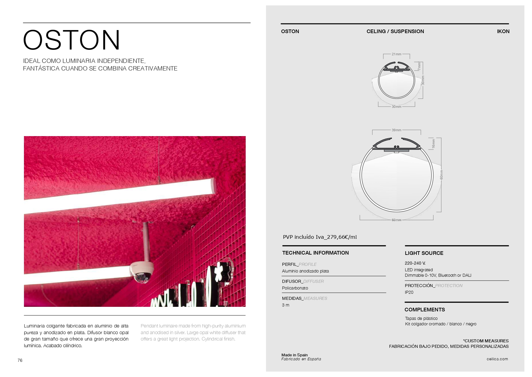 La IKON OSTON es una luminaria colgante de aluminio anodizado con difusor opal de gran tamaño. Su acabado cilíndrico y su potente proyección de luz la convierten en una solución elegante y versátil para interiores modernos.