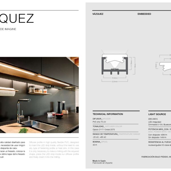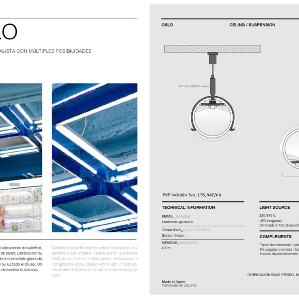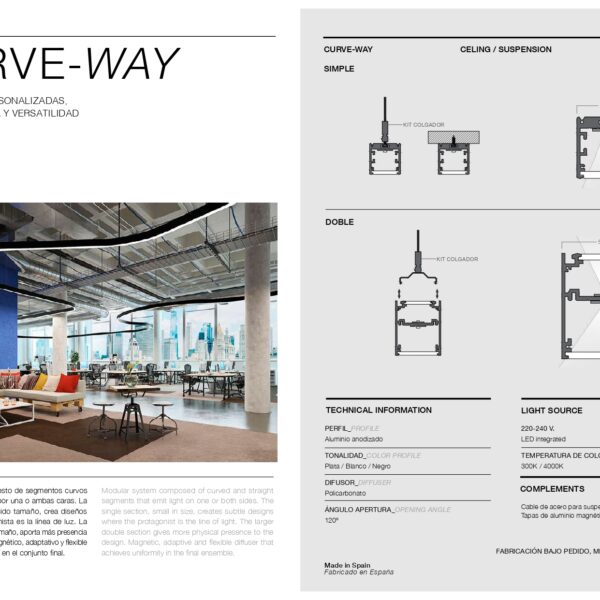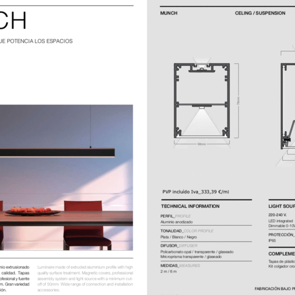 Equipado con difusores de policarbonato opal o transparente, permite elegir entre una luz suave y difusa o una más directa y técnica, adaptándose a las necesidades de cada proyecto. Su diseño robusto y elegante lo convierte en una opción ideal para residencias modernas, oficinas, hoteles y espacios comerciales.